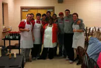 The players assisted by washing dishes, serving food and drinks to clients, waiting tables, cleaning the soup kitchen after lunch, making food boxes for the needing and providing good company for those people eating.