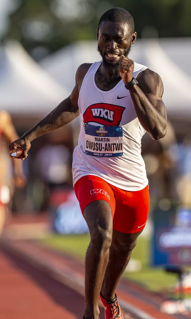 Championship competition opened with the combination of Will Bush, Martin Owusu-Antwi, Abdur Kelly and Gates posting a 39.24 in the men's 4x100 relay to tie for 12th place and earn All-American status. The Hilltoppers finished fifth in the third and final heat with the top three finishers earning a spot in Friday's finals while the fourth team ahead of the Tops was left out by one hundredth of a second.